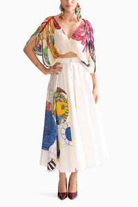Featuring Alaia Ivory Blouse with Cora Skirt by Saaksha & Kinni from Botanica Collection. Embrace effortless elegance with this exquisite daisy print hand micro pleat V-neck kaftan blouse. It showcases a drawstring waist and sleeves for a customizable fit and flowy silhouette. Complement your look with tribal placement print high-waist flared midi skirt, designed to add a bold, dynamic flair to your outfit with its flattering high waist and flared shape.