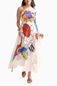 Featuring Alana Ivory Kaftan by Saaksha & Kinni from Botanica Collection. A tribal print asymmetric one-shoulder kaftan with side tie and dori detailing, accentuating a slip for added coverage. This design blends bold patterns with stylish, adjustable showcases for a unique and elegant look.