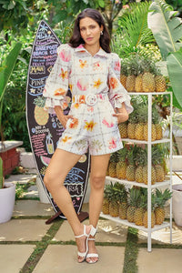 The Alani Shirt and Shorts set is your ultimate summer staple, combining breezy comfort with island-inspired elegance. The shirt features a classic collar, voluminous ruffled sleeves, and a relaxed silhouette, making it perfect for warm, tropical days. Paired with the high-waisted Alani Shortsâ€â€Âdesigned with an invisible back zip, side pockets, and a detachable buckle beltâ€â€Âthis coordinated look offers effortless style and versatility. Whether worn together or mixed with your favorite separates, this duo brings a fresh, playful charm to any resort-ready wardrobe.
