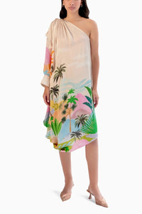 The Alaya Midi is a stunning one-shoulder asymmetrical dress crafted from luxurious viscose satin georgette, offering a free-flowing silhouette that exudes effortless elegance. Available in two beautiful placement prints—By the Sea and Forest—this dress evokes the peacefulness of nature and the serenity of coastal escapes. Delicate tassels with beads adorn the shoulder, adding a playful yet sophisticated touch.