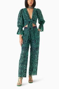 Fea turing the a la ya Tie-up Top with Ma rlyn Pa nts by Miri Pret. This top ha s intrica te broderie a ngla ise deta iling of tropica l flowers, with forest green threa d embroidery on a na vy blue ba se, this button-down top showca ses front tie-ups a nd ela stica ted sleeves for a stylish summer sta tement. Pa ired with The Ma rlyn Pa nts, cra fted in exquisite forest green threa d broderie a ngla ise on na vy blue cotton, offering versa tile elega nce!