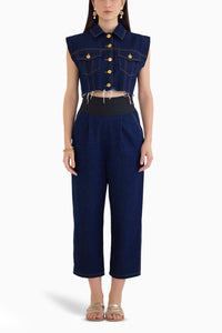 Featuring the Alba Co-ord Set by House Of Exotique. This tailored dark blue raw denim set includes a crop shacket with extended shoulders, spread collar, and button fastening, and crop-length pants with a broad waistband, zipper fastening, and front and back pockets.