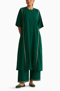 Emerald Green Kaftan kurta set with placement embroidered detail & round-neck. Paired with embroidered straight pant.