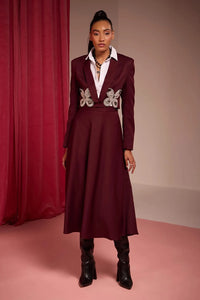 This stunning co-ord set features a wine crop blazer with full sleeves and a deep neckline, showcasing a chic front opening. The embroidered butterfly patch adds the perfect glam to the outfit, Paired with midi length flared skirt in the same color with side zipper opening.
