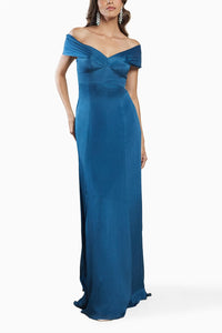 A captivating ensemble with an off-the-shoulder wide V-neck and an elegant A-line skirt. The shoulder-baring silhouette adds allure, while the A-line cut flatters your figure. Radiating tranquility and sophistication, this gown ensures a lasting impression at any special occasion.
