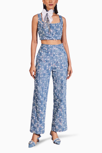 Featuring the All About You Denim Co-ord Set from House of Zeniaa's Rodeo Blue Collection. This versatile ensemble includes a textured denim crop top paired with straight-fit denim pants. Elevate your style with a white shirt underneath and accessorize with chunky pieces and pumps.