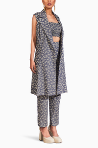 Featuring the All Gardens Denim Co-ord Set from House of Zeniaa, a complete, effortless, and trendy ensemble. This 3-piece set includes a denim bustier, high-rise pants, and a sleeveless denim over jacket. Dress it up with heels and statement accessories for a polished look.