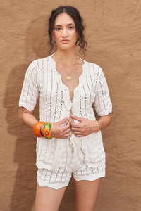 Elevate your casual wardrobe with the Allegro Knit Co-ord Set, crafted from 100% cotton for ultimate comfort. This relaxed-fit set features a stylish V neckline and a button-up front, creating a laid-back yet chic look. The high-waisted bottom comes with an elasticated waist and drawstring for a customizable fit. Unlined and semi-sheer, this versatile set is perfect for warm days or layering, making it a must-have for effortless style!