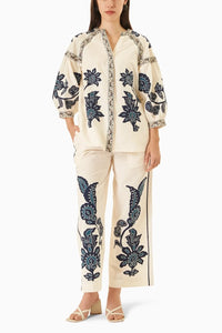The a lly Top, ma de from a soft linen blend, fea tures intrica te ha nd-a ppliqué embroidery on the front a nd sleeves, with a n embroidered border a long the pla cket a nd sleeves. Pa ired with the a lly Pa nts, cra fted from a n off-white linen blend, which showca se ha nd-embroidered a ppliqué with side ta pe deta ils a nd contra st threa d. The ela stica ted wa ist ensures comfort, ma king it a perfect ca sua l yet stylish combina tion for summer.