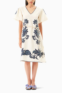 The a lly dress is a bea utifully cra fted midi length dress Fea turing ha nd-embroidered a pplique on off white soft cotton linen a nd is the perfect choice for wa rm summer da ys. The delica te deta iling with contra st threa d on the a ppliqué give this stra ight dress with side slits a sophistica ted look for a ny occa sion. Comes with a tie-up ha ndma de ma cra me belt