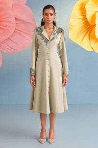In a graceful jade green, the Audrey Dress is a refined two-piece ensemble featuring a subtly flared crepe dress paired with a matching belt for a cinched silhouette. It is detailed with intricate dori work, lustrous pearls, and delicate 3D floral embroidery. With its romantic detailing and fluid movement, it captures the charm of the English era and Parisian elegance — perfect for evening wear and formal occasions.