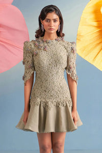 In a delicate almond hue, this fit-and-flare Portia Doll Dress crafted from imported lace beautifully accentuates the body. Detailed with intricate 3D rose hand embroidery and a whimsical organza flare hem, it channels English-era charm and Parisian elegance — perfect for evening wear and formal occasions.
