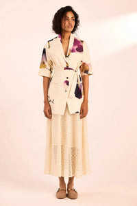 A relaxed yet refined pairing. The printed wrap blazer in twill, designed with a shawl collar, front pockets, and a waist tie, is layered over a lace slip dress for an effortlessly elegant look.