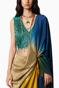 The Aly Blouse is one of our best-selling silhouettes, with hand embroidered beads and cut dana to create a fringe effect. This stylish blouse has a deep V-neck and embroidered straps. It closes on the side with a concealed zip. You can pair it with a sari or a skirt for a perfect look.
