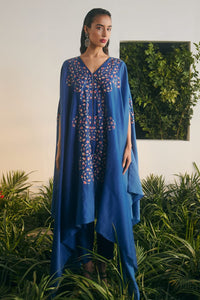 Featuring Alyaa Cape Set by Shikha Mehta from Baagh Collection. This cobalt blue silk chanderi cape adorns intricate front-open thread embroidery. It pairs beautifully with silk chanderi cigarette pants and a short cotton slip, offering a blend of luxurious fabric and elegant design for a sophisticated, stylish ensemble.