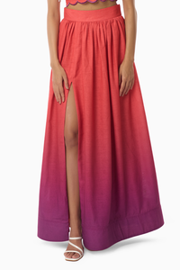 This ombre linen skirt exudes elegance with its cinched high waist and flowing flared silhouette, while a front slit adds a touch of modernity. Featuring side pockets and an invisible zip closure, it offers both style and versatility for various occasions.