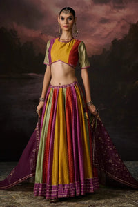 Featuring the Amal Multicolor Lehenga Set by Swatti Kapoor's Firdaus collection. This vibrant two-piece set features a handwoven 60gm Chanderi skirt lined with cotton, adorned with delicate hand embroidery—perfect for festive flair with artisanal elegance.