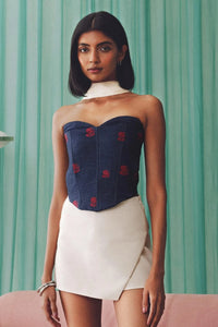 Elevate your summer style with this structured denim corset, featuring a sleek silhouette and subtle boning for a flattering, sculpted fit. Accented with delicate red shell embroidered motifs, this piece blends casual charm with refined craftsmanship. The strapless neckline and contoured seams make it perfect for pairing with skirts or high-waisted trousers for a bold, fashion-forward look.