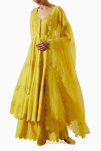 Featuring Amaltaas Kali Kurta Set by Label Earthern from their Band Phool Collection. This yellow cotton mal kurta set showcases intricate resham embroidery with mirror detailing, complemented by a scallop palazzo and organza silk scallop dupatta, offering a vibrant and sophisticated look.