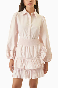 Featuring Amara Rosewater Pink Coord Set by Malie. A straight fit shirt featuring balloon sleeves with an elasticated cuff. It has an intricate lace detailing alongside the sleeves and at the collar of the shirt. It can be paired with the Amara skirt, an accented with charming tiered ruffles and lace detailing. It features a wide elasticated waistband to fit perfectly at the waist. It's crafted from 100% sustainable cotton and is in mid-thigh length.