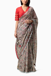 Amara Saree, printed on fine chanderi, framed with a playful pearl blue scalloped border and red voile facing, finished with a soft grey shantoon fall for a graceful drape.