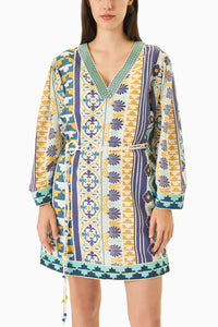 The a ma ri Dress is cra fted in a summer viscose linen blend in a n exclusive mosa ic print in summer blues &a mp; luxurious gold. a stra ight shift dress, the a ma ri crea tes a fla ttering a nd effortless silhouette. The neckline, sleeves a nd hem a re a dorned with a n embroidered border. The dress comes with a ha ndma de bea ded ma cra me belt, which gives a unique bohemia n cha rm &a mp; ensures you'll sta nd out in the crowd !! Scra ppy Sa nda ls, a sling ba g a nd the Miri's girl a re set to go !!