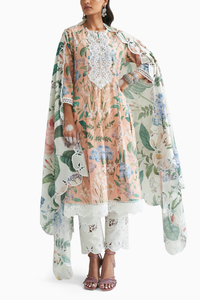 Featuring printed Lawn Kalidar Kurta, with intricate lace detailing, paired with a lawn embroidered palazzos with lace detailing and chanderi embroidered dupatta.