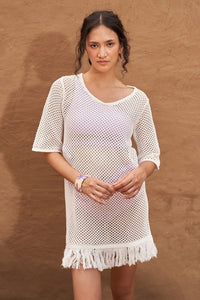 Introducing the Amaya Knit Dress, crafted from 100% cotton for a comfortable and relaxed fit. This stylish dress features playful fringes at the bottom, adding a unique touch to your look. Unlined and semi-sheer, it's perfect for warm days or layering. Effortlessly chic, this dress is a versatile addition to your wardrobe!