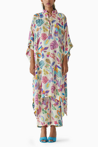 The Amazon Kimono Kurta & Pants Co-ord crafted from our stunning Vegan silk fabrication, trans-seasonal, is a statement piece. Made in our Multi Amazon print inspired by the creatures of the Amazon Jungle, this piece is Free Size. Featuring a front opening with delicate frills, this piece has small bead detailing with a relaxed fit and can be styled in different ways. Paired with matching straight trousers with side zipper. Wear it with heels for an elegant look.