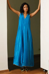 Featuring the Ambar jumpsuit, crafted in luminous blue Chanderi fabric. It has a deep V-neck, wide flowing legs, and side seam pockets for convenience. Fully lined and designed for ease of movement, this handcrafted jumpsuit from India is perfect for festive occasions.