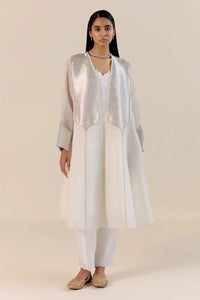 The Amber Choga is exquisitely crafted in luxurious handwoven Kimkhwaab Tissue Tanchoi and pure organza and hand embroidered with pearls. The Choga can be paired with a sleeveless kurta and silk pants