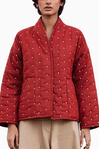 A brick red quilted jacket with built up neckline, full sleeves, with two front pockets and brick red lining.