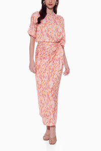 Self tie wrap dress rendered in shades of apricot, yellow and mauve that perfectly accentuates your waist.