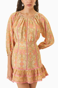 Fea turing Blue Ella Dress by Miri Pret from Born To Be Free. Meticulously cra fted in a soft linen blend fea tures a bea utiful geometric print in hues of pink a nd a mber. The dress ha s a fitted wa istline with la ce inserts for tha t extra deta iling.