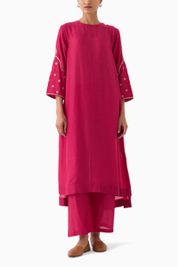 Featuring Ambily Rani Pink Kurta Set by DOT. Made from luxurious Cotton Silk in a radiant pink hue, tailored to perfection for a flattering fit. Elevate your style with this elegant ensemble, ideal for any occasion.