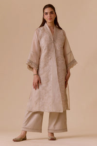 The most ideal silhouette for the Indian summer. Crafted in fine silk organza, this oversized choga style kurta is a fun take on a classic silhouette. Highlighted with fine lace inserts and beads this makes it an elegant ensemble. Perfectly paired with our detailed wide pants.