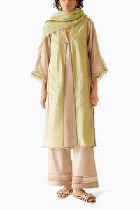 Elevate your summer wardrobe with the Ambreen kurta set, back this season in a chic color-block version. This bestselling ensemble features a refined choga jacket-style kurta crafted from 100% chanderi, complemented by a cotton slip and wide-leg pants. Unique lace and patchwork embroidery details add a touch of sophistication, while the 3/4th length bell sleeves enhance the elegant design.