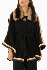 The ca pe in bla ck knit ha s a n ea sy silhouette with a deta cha ble belt a s well a s a fa ux chinchilla fur colla r . a ca ble knit edge trim a nd the jewel buckle on the a meera ca pe just a dds to its oomph !