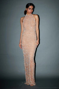Featuring the Amelie Nude Gown by ITRH's Diwali Jaaneman Collection, this nude column gown is embellished with crystal beads, featuring a deep back and a daring slit, offering a luxurious and sleek silhouette for a sophisticated and bold look.