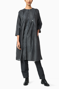 Featuring the Americano Chanderi Tunic with Trouser Set by Jayati Goenka. This set includes a natural-dyed charcoal Chanderi button-down tunic paired with cream linen salwar trousers. The tunic features a pin-tuck yoke with intricate handwork in golden thread and signature handmade buttons.