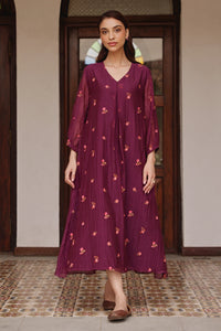 The Amethyst Bloom Dress features an elegant, flowy silhouette adorned with delicately embroidered blooms scattered across the dress and cuffed sleeves. Its breezy design and refined detailing make it an ideal choice for effortless celebrations and sunlit gatherings, offering both comfort and sophistication.