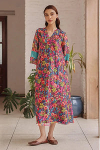 The Amethyst Bloom Dress features a breezy silhouette adorned with multi-hued printed florals, and contrasting borders along the sleeves. This dress offers an effortless, elegant look perfect for festive occasions and beyond.