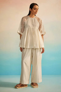 Light and graceful, the Ami Jaal Raglan Top features soft gathers, sheer embroidered organza sleeves, and thoughtful tailoring. It pairs with the fluid Hama Akari Stripe Pants. A set that blends comfort, craft, and quiet elegance.