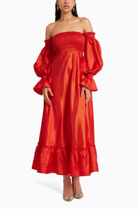 Featuring Amie Poppy Red Dress by Malie. This dress is a versatile piece designed to be worn either on or off the shoulder. It includes elasticated detailing across the bust and back, ensuring comfort and a secure fit. The sleeves also include elasticated detailing, allowing them to be worn on the shoulder or off for different styling options. Crafted from satin, this dress exudes elegance and sophistication, falling gracefully to ankle length.
