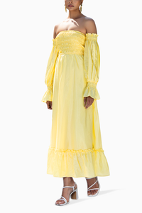 Featuring Amie Lemon Sorbet Dress by Malie. A versatile dress that can be worn on and off-shoulder. It has elasticated detailing across the bust and back for comfort and elasticated detailing at the sleeves to allow it to sit on the shoulder and off-the shoulder. It's crafted in satin and comes in ankle length.