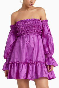 Featuring Amie Purple Dress by Malie. This dress is a versatile piece designed to be worn both on and off the shoulder, offering flexibility in style. It has an elasticated detailing across the bust and back, ensuring comfort and a secure fit. Additionally, elasticated detailing at the sleeves allows for easy adjustment between on-the-shoulder and off-the-shoulder wear. Crafted from satin, this dress exudes a luxurious feel and falls to thigh length, making it an ideal choice for various occasions.
