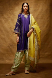 A stunning silk salwar and chanderi kurta set, adorned with exquisite zari, sequin, and cutdana embroidery. Paired with a delicate chanderi dupatta, this ensemble exudes elegance and is perfect for festive celebrations and special occasions.