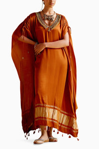 Orange Kaftan in solid color, with peacock motifs and ghungroos embellished V neck, and tie-up detailing on the shoulders with ghungroos to create a stunning look!