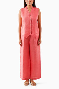 Crafted from premium linen, this co-ord set offers the perfect blend of sophistication and comfort. The breathable fabric keeps you cool and composed, ensuring you look and feel your best throughout the day. The sleek, sleeveless style in a striking pink hue with button closures is your go-to choice for a wide range of occasions, including office events, work brunches, museum dates, and more.