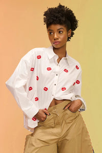 Featuring Amour White Shirt by Chilosophy's Queendom Collection, this free-size poplin shirt offers a crisp, lightweight feel with a quirky twist. Metallic button closure, playful lip embroidery, contrasting cuffs, and a ‘sealed with a ...’ quote on the sleeve.